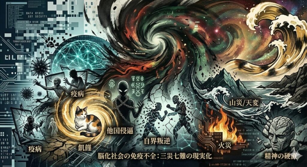 「立正安国論」で、日蓮が **「三災七難」** というアラートを鳴らしたのは、**国家や社会という巨大な生命体の「免疫不全」への警鐘** です。
